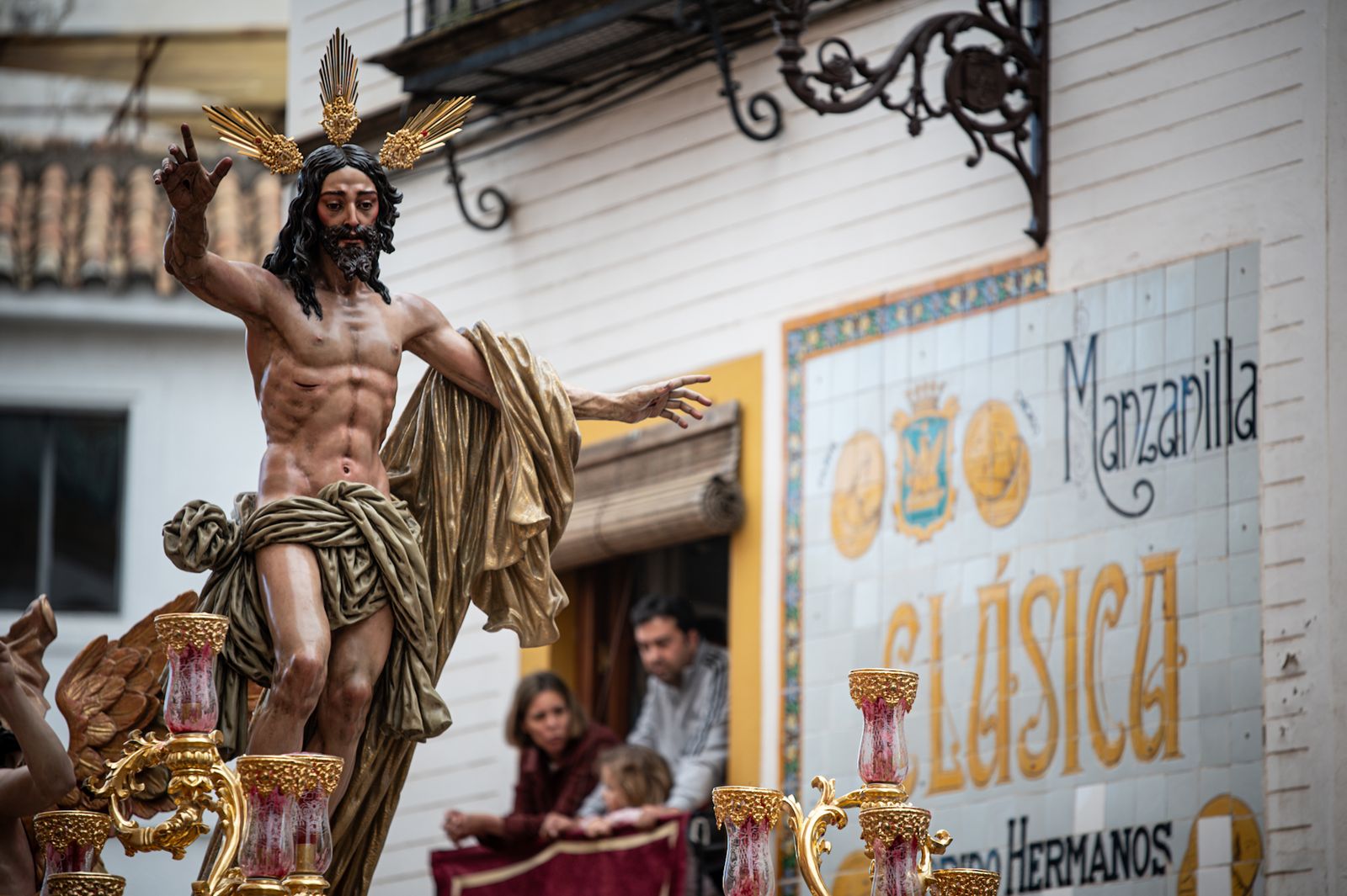 El paso por la calle Jesús del Gran Poder ha dejado estampas inéditas: el blanco de las túnicas de la Resurrección recortándose contra la fachada jesuita, uniendo visualmente dos barrios, dos estilos y una misma fe.